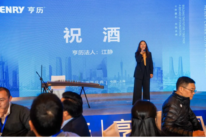 举杯同庆,共赴新程 进入温馨而欢快的晚宴祝酒时刻,亨历法人江静女士向全场嘉宾致以诚挚问候与美好祝愿!全场嘉宾共同举杯,美酒碰响间,盛满了对十年过往的致敬,更饱含着对下一个十年的憧憬与期许,将庆典的热烈氛围定格在同心共赢的温情时刻。