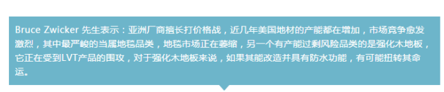 美国NWFA地板协会主席Chris Zizza先生,在结束展会参观行程返回美国之前表示说,他对中国地面材料行业的整体进步感到吃惊,他在现场发现了非常多的地毯,木地板,弹性地板的生产企业,他们的产品品质完全跟世界接轨。他最看好的地材品类是木地板,NWFA协会曾经做过一次对美国消费者的调研,2/3消费者表示他们希望在他们梦想的家中使用木地板,随着美国千禧一代进入他们生活的购房阶段,且随着普通消费者购买力的增强,木地板需求将会增加。针对弹性地板,他展会现场的观察是,中国的一些PVC弹性地板企业主要是OEM/ODM经营模式,自主研发能力和品牌建设能力与国际品牌存在差距。他希望我们中国同行重点关注莫霍克工业公司、萧氏工业集团、博优美国公司(Beaulieu America)、英特飞Interface,这些品牌都有弹性地板业务,覆盖多种地材品类,他们是以不同产品线的策略进军住宅及商用两大市场。